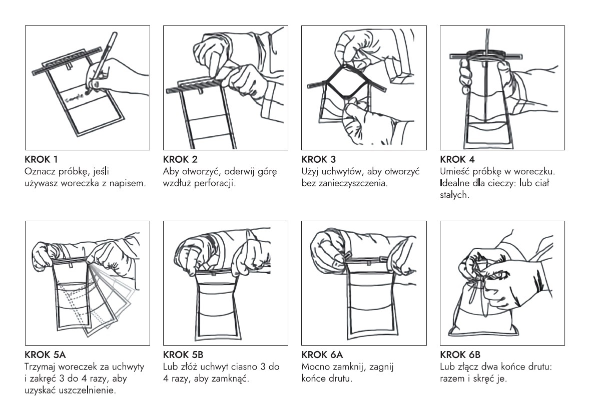 - Szczelne zamknięcie (trzykrotne okręcenie woreczka wokół zamknięcia i zagięcie końcówek zapewnia szczelność woreczka)