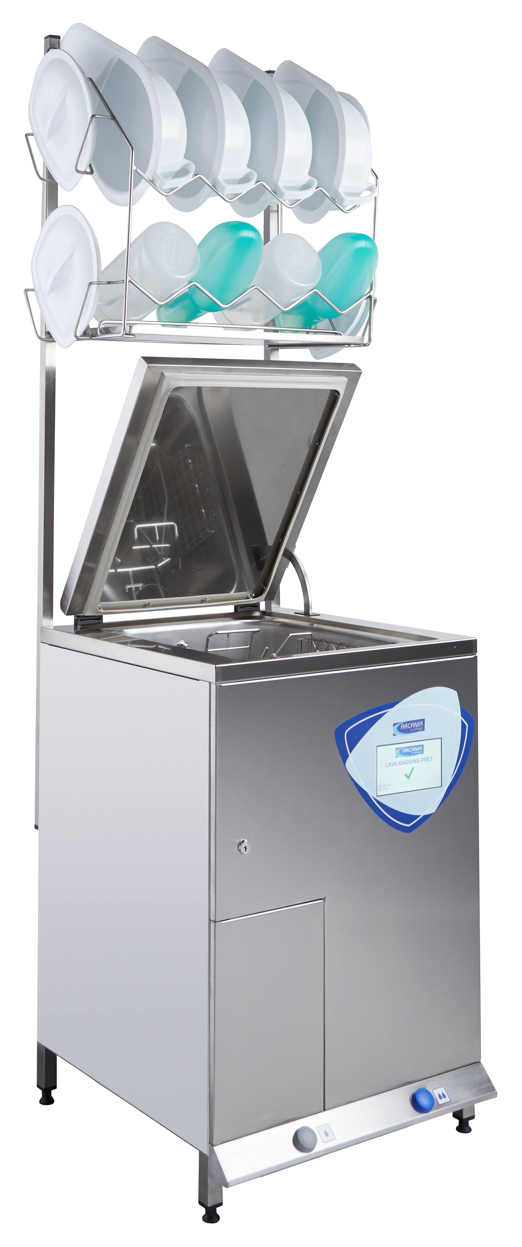 Myjko dezynfektor min. do kaczek i basenów CLINOX 3A, gwarantuje 100% automatyczną obsługę bez użycia rąk. Wszystko to jest możliwe dzięki 12 dyszom ze stali nierdzewnej (w tym 4 obrotowym).