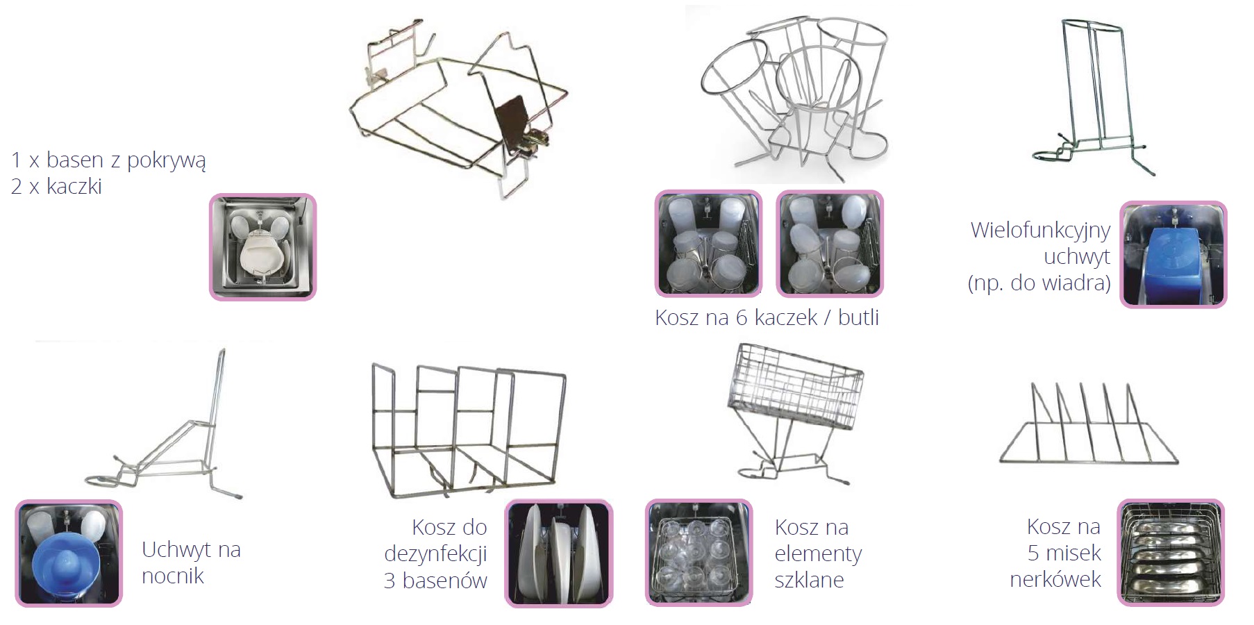 • Różnorodność koszy (uchwytów) do jednoczesnego mycia naczyń sanitarnych (basenów, kaczek, wiader, butelek na mocz itp.)