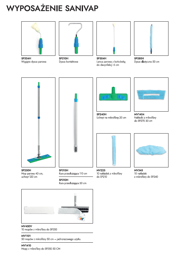 Wraz z urządzeniem Sanivap oferowane są protokoły użytkowania dostosowane do potrzeb. Sanivap posiada szeroką gamę akcesoriów, które są ergonomiczne i dostosowane do protokołów bionetowania. Dzięki nim możliwe jest zapewnienie wysokiej wydajności dezynfekcji oraz doskonałej ergonomii pracy dla użytkowników. Wybór akcesoriów zależy od indywidualnych potrzeb klienta. Sanivap oferuje również gamę technicznych mikrofibr, które optymalizują wydajność urządzenia.